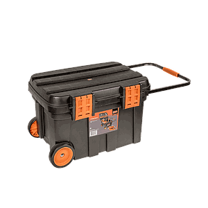 Espuma estructural resistente al agua, mango telescópico y ruedas heavy duty, gran compartimiento para transportar herramientas eléctricas, cierres metálicos anti óxidos y altamente resistentes.