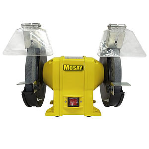 Esmeril de Banco en 6” MOSAY, para uso en taller o casa de uso no profesional; para desbaste, pulido, sacar pintura, oxido y residuos y afilado de herramientas metálicas. Cuenta con protectores anti chispa para proteger de salpicaduras y/o quemadura a causa de esmerilado y residuos generados por acción del desbaste.