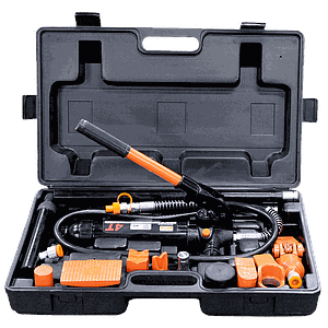 Cada juego contiene: bomba manual, manguera, pistón de cilindro hidráulico, pistón esparcidor, cabezal de goma, base plana con revestimiento de goma, base en V de 90 °, asiento dentado, adaptador de rosca macho y una amplia selección de tubos de extensión